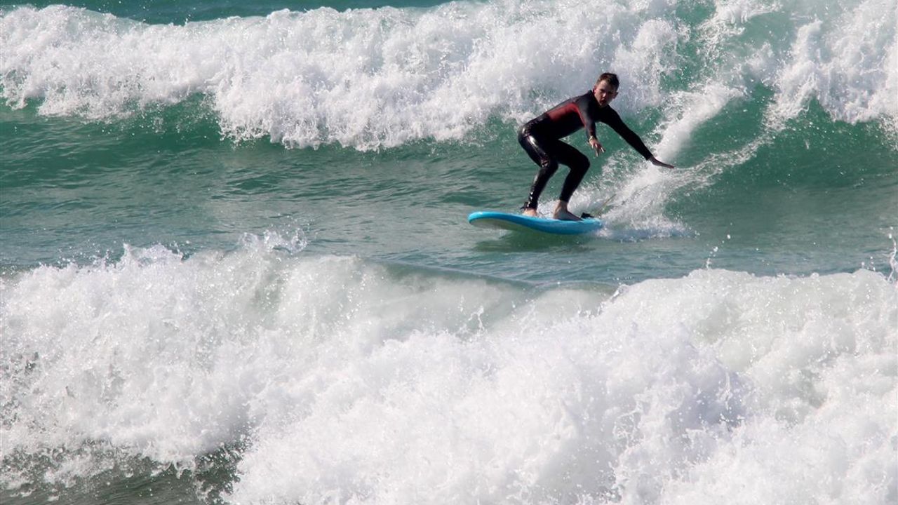 Güneşli havanın etkisini gösterdiği ilçede hafif rüzgar da etkili oldu. Denizde dalga boylarının yaklaşık 2 metreye ulaşmasını fırsat bilen yerli ve yabancı 5 sörfçü de sahile geldi.