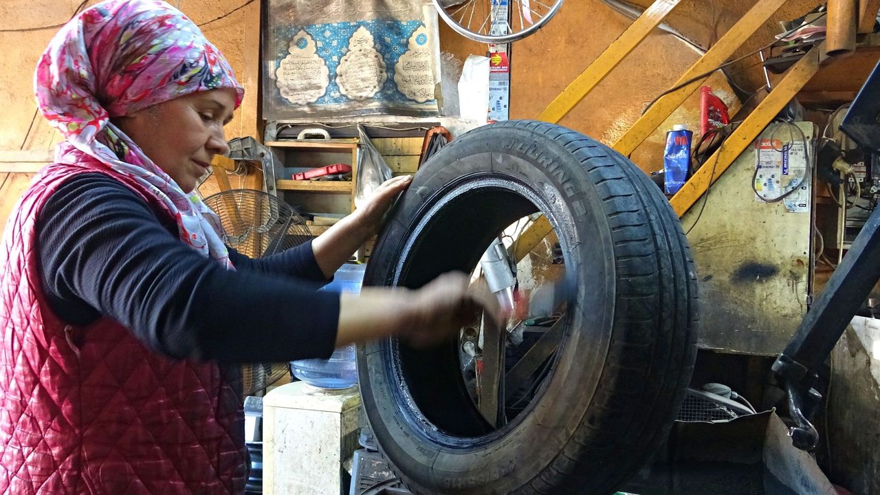 Antalya'nın Muratpaşa ilçesinde eşi ile birlikte yaklaşık 30 yıldır lastik tamirhanesi işleten Mümine Kökçe, kadınların zorlu mesleklerde de ne kadar başarılı olabileceğini kanıtlıyor. Erkek işi olarak görülen lastik tamirciliğini bir kadın olarak 'yapılamaz, zor' denilen işleri yapmanın mutluluğunu duyduğunu söyledi. Eşi ile evlendikten sonra ilk olarak tamirhaneye gelen müşterilerle ilgilendiğini, daha sonra ise internette gördüğü kadınların yaptığı işlerden aldığı ilham ve eşinin desteği ile 7-8 senedir de lastik tamir ettiğini belirten Mümine Kökçe, "30 senedir burada eşimle birlikte çalışıyorduk. Daha doğrusu ben onun ayında duruyordum. Baktım internette kadınlar söküp takıyor, çeşitli işler yapıyor. Eşim ‘Neden sende yapmıyorsun' dedi, biraz onlardan ilham alıp bende lastik söküp takmaya başladım. 7-8 senedir de kendim yapıyorum. Öğrendiğime çok seviniyorum" dedi.