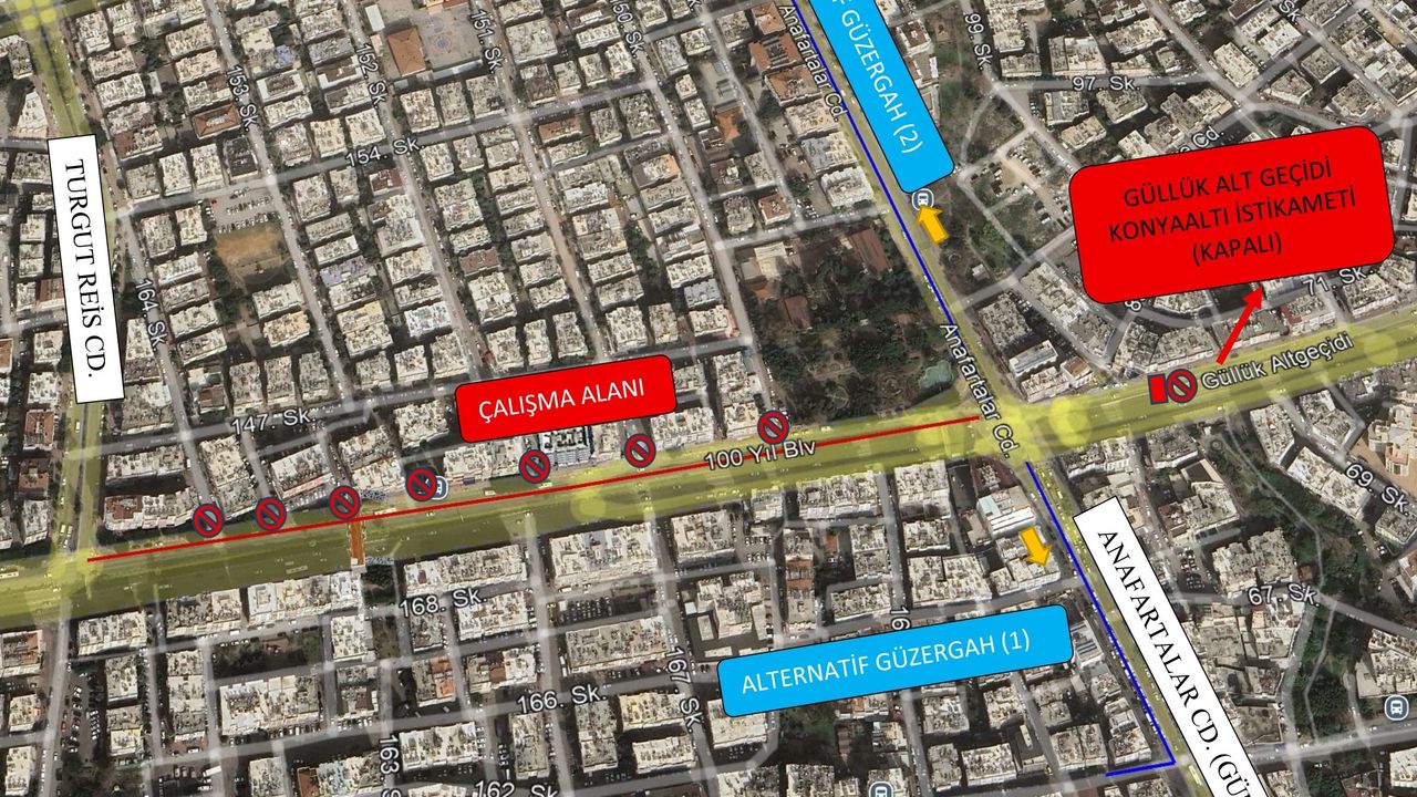 Çalışma kapsamında 100. Yıl Bulvarı’nın ( Şehir Merkezi istikametinden Konyaaltı gidiş yönü) Anafartalar Caddesi (Güllük) ile Turgut Reis Caddesi arasında kalan bölümü 15 Şubat Pazar günü sabah 07:00 itibariyle trafiğe kapatılacak. Yolda yoğun bir çalışma yapılarak 16 Şubat Pazartesi günü sabah saat 06:00’da yolun trafiğe açılması planlanıyor. Çalışma süresince sürücülerin, alternatif güzergâhları kullanmaları istendi.