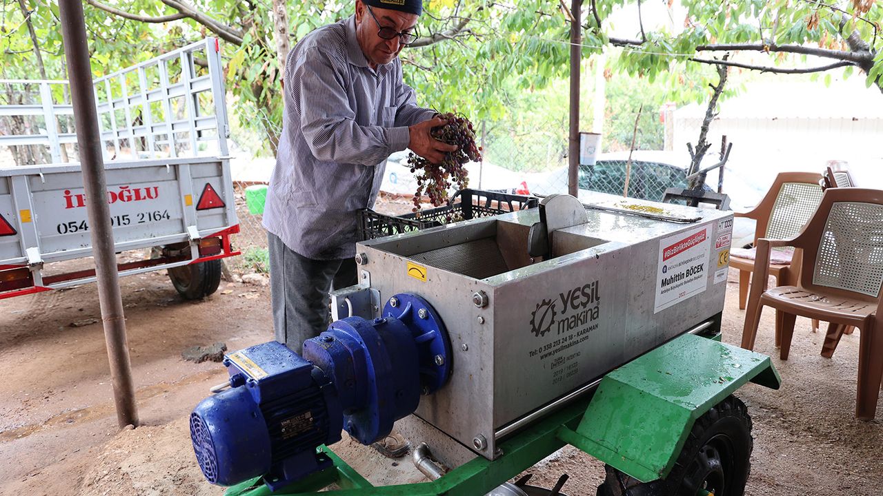 Büyükşehir Belediyesi Tarımsal Hizmetler Dairesi Başkanlığı, yerelden kalkınma hedefleri doğrultusunda üreticilere makine desteği sağlamaya devam ediyor. Antalya genelinde toplamda 23 üzüm sıkma makinesi mahalle mahalle dolaşarak pekmez üretiminde kullanılıyor. Pekmez üretiminde insan gücüyle saatler sürecek üzüm sıkma işlemi üzüm sıkma makinesi ile dakikalar içerisinde yapılarak üreticilere iş gücü sağlıyor. Zaman ve ürün kaybının da önüne geçen makineler üreticilerden yoğun ilgi görüyor. Antalya’da üzüm üretiminin en çok yapıldığı ilçelerin başında yer alan Elmalı’nın mahallelerine gelen talepler doğrultusunda Antalya Büyükşehir Belediyesi tarafından 6 üzüm sıkma makinesi hibe edildi.