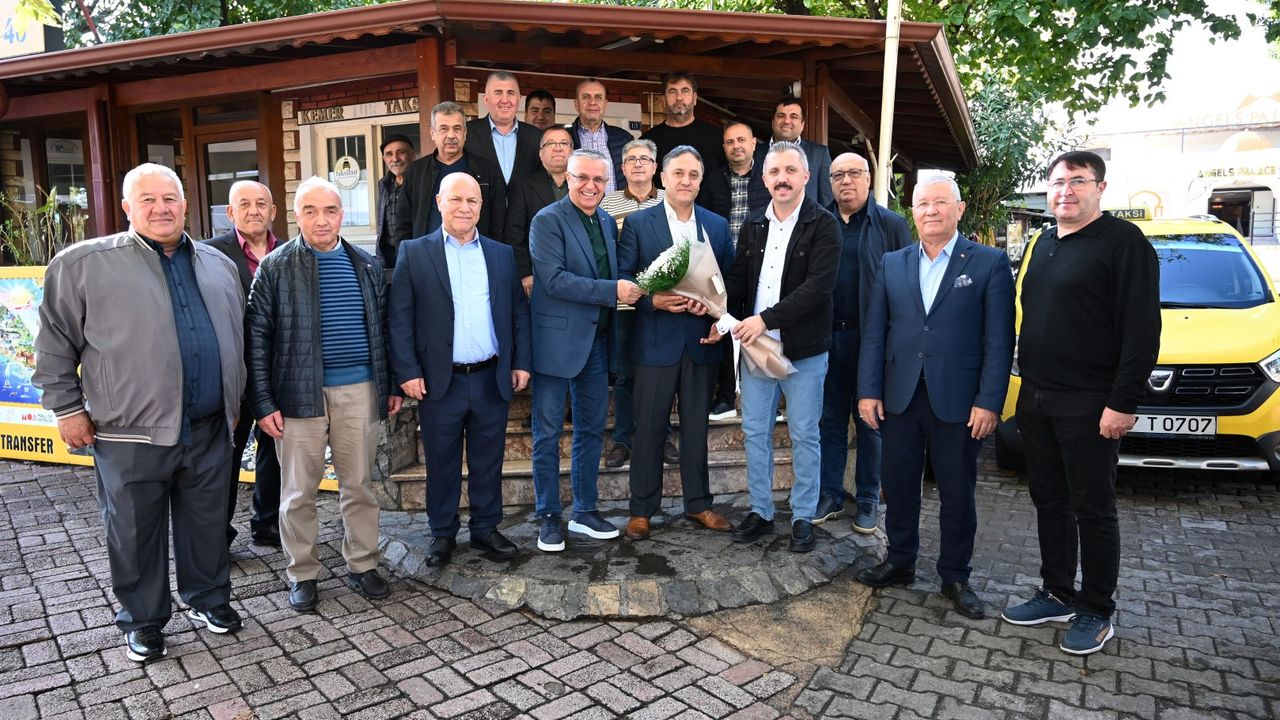 Kaymakam Solmaz ve Başkan Topaloğlu daha sonra Kemer Taksi Durağını da ziyaret ederek, taksi şoförleriyle sohbet etti. Ziyaret sonrası Kaymakam Solmaz ve Başkan Topaloğlu, Kemer Şoförler ve Otomobilciler Odası Başkanı Mustafa Tıraş ve şoförlerle hatıra fotoğrafı çektirdi.