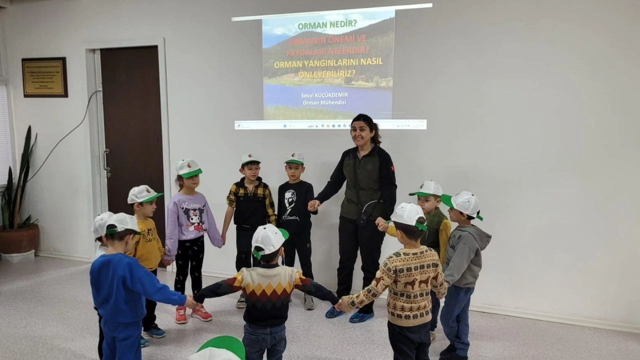 15 Temmuz Şehitler Anaokulu’nda eğitim gören minik öğrencilere ormanların önemi, orman yangınlarının önlenmesi ve doğayı koruma bilinci konularında bilgilendirildi. Ormanların oksijen kaynağı ve iklim üzerinde düzenleyici etkiye sahip olduğunu belirten Orman İşletme Müdürlüğü Müdür Yardımcısı Seval Küçükdemir, “Ormanlar, sadece bulundukları bölgenin havasını temizlemez, aynı zamanda bol yağış almasını da sağlar. Ayrıca ormanlardaki ağaçların kökleri toprağı tutarak erozyonu ve sel baskınlarını önler” diye konuştu.