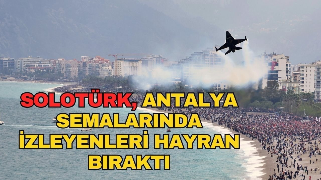 Türk Hava Kuvvetlerinin akrobasi ekibi SOLOTÜRK, Antalya'da 23 Nisan Ulusal Egemenlik ve Çocuk Bayramı kutlamaları kapsamında gerçekleştirdiği gösteriyle binlerce vatandaşı bir araya getirdi. Türkiye Büyük Millet Meclisi'nin açılışının 106'ncı yıl dönümü ve 23 Nisan Ulusal Egemenlik ve Çocuk Bayramı dolayısıyla düzenlenen etkinlikler kapsamında, Türk Hava Kuvvetleri F-16 Akrobasi Timi SOLOTÜRK Antalya semalarında uçuş gerçekleştirdi. Konyaaltı Sahili ile Olbia Kent Meydanı'ndan izlenen gösteri, alanı dolduran vatandaşlara heyecan dolu anlar yaşattı.